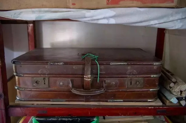 这只古铜色的皮箱,是张富清在文化速成中学上学时买的。当时他用一块红布把拿生命换来的奖章和证书包裹好,锁在箱底,封存至今。60多年,锁头早就坏了,一直用尼龙绳绑着。
