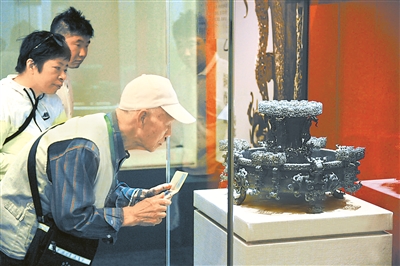 参观者近距离观看中国战国时期“曾侯乙”铜尊盘。