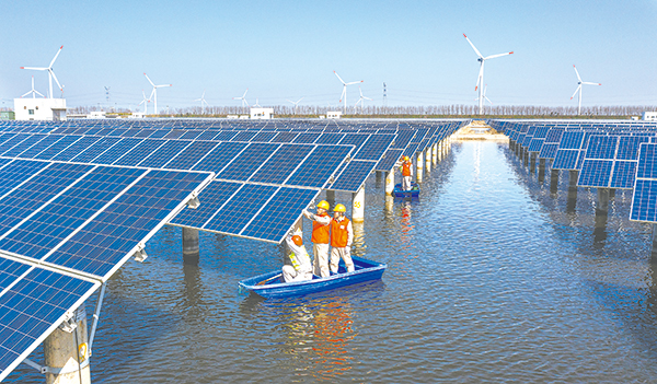 今年以来,我国国民经济持续稳定恢复,新动能继续成长,高质量发展取得新进展。图为3月15日,江苏省南通市海安市滨海新区,电力工人在35兆瓦“渔光互补”光伏发电站巡检光伏发电设施。(图片来源:视觉中国)